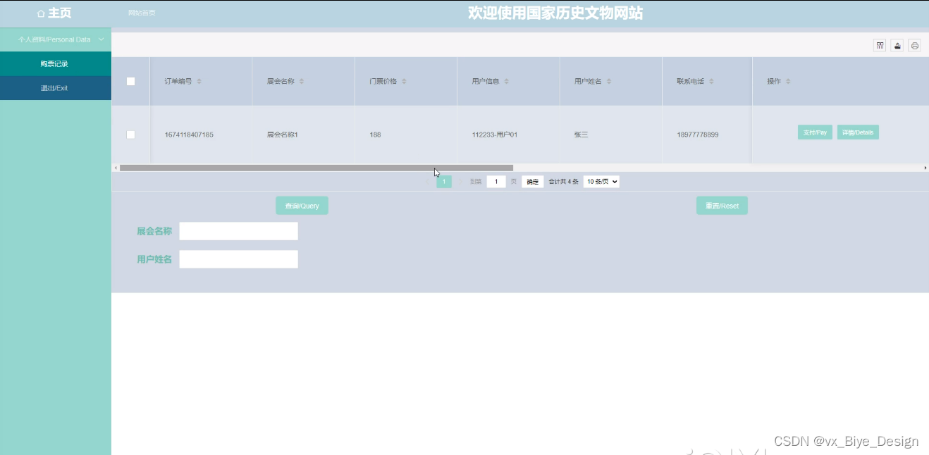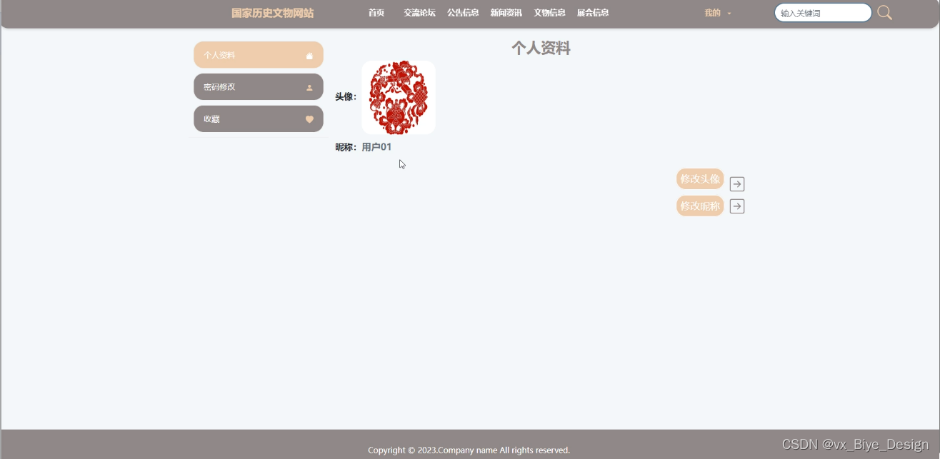用户前台;首页、交流论坛、公告信息、新闻资讯、文物信息、展会信息、购票记录、我的等功能模块。