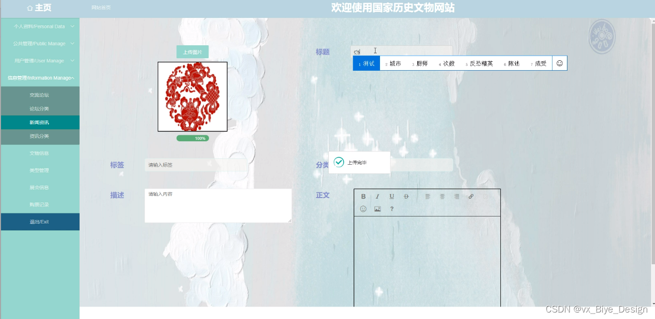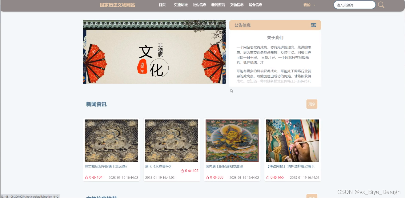 在当今世界,互联网快速发展的现在,如何利用互联网创造更简单高效的生活,这是我们首要讨论的。需要国家历史文物相关网站,一方面使得管理员可以对国家历史文物网站的信息进行及时更新和信息化的管理,可以较为容易的获取历史文物信息,系统的操作更加的准确,这是一种潜在趋势,或许可以有效加快国家历史文物网站的普及情况。