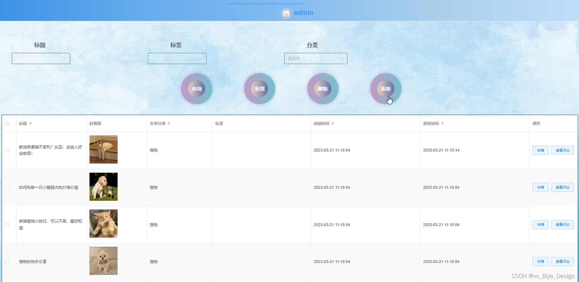 宠物资讯,管理员在此页面可以通过标题、封面图、标签等查看宠物信息,进行重置、删除、添加、查看评论等操作。