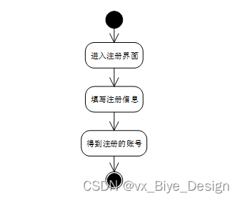 用户管理针对所有用户和管理员。未注册用户点击注册,进入注册页面填写新用户信息,得到自定义生成账号后,注册完成。未注册用户注册的活动图如下图所示。