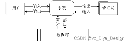 如下为系统的顶层数据流图,外部实体有用户和管理员,分别对系统输入数据,从而得到要输出的数据。