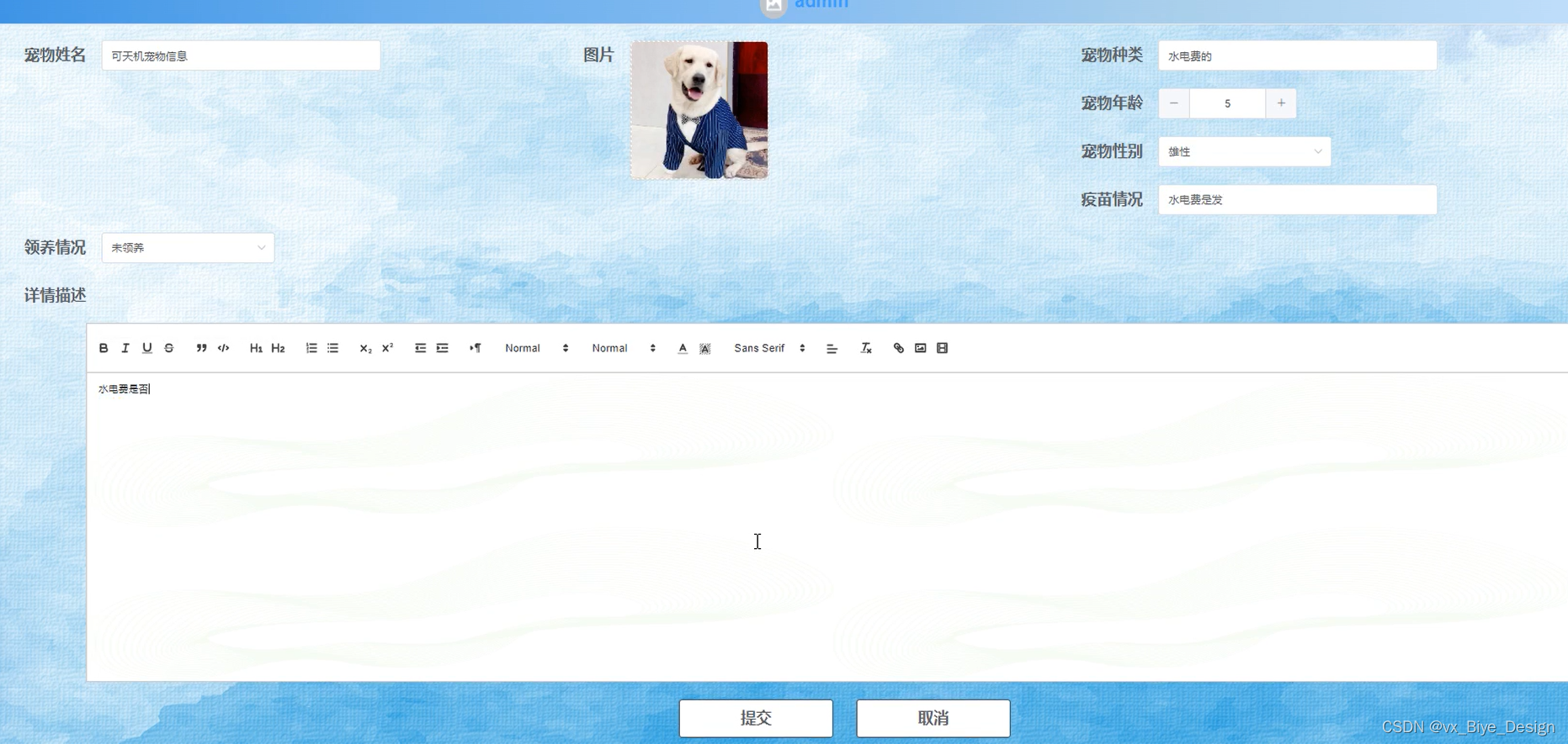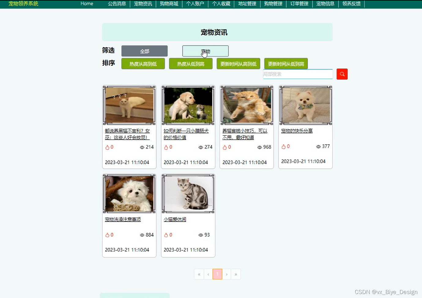 The pet adoption system is based on a browser and server architecture platform, developed using a cross platform JAVA language, using the SSM framework for logical control, MySQL database to store data, and finally Tomcat server to complete the release. The system can run in multiple environments.