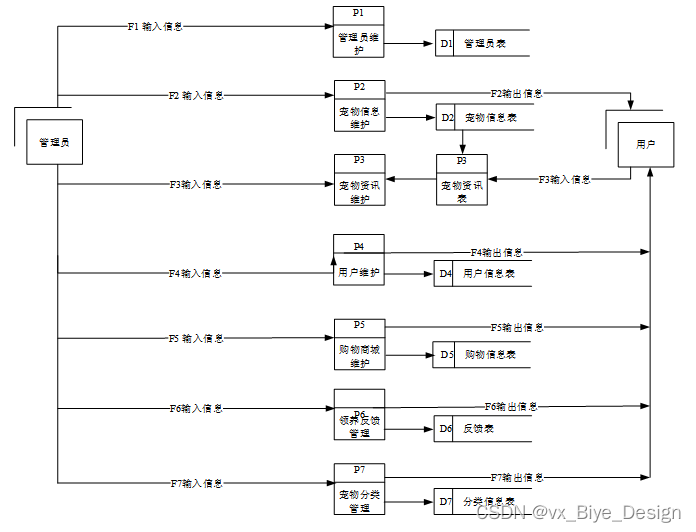 宠物领养系统底层数据流图主要描述系统底层模块的数据流、数据载体、数据处理、外部实体的具体交互。本系统就是管理员和普通用户在用户管理、宠物信息、领养反馈等模块上的数据交互。