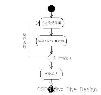 用户可进行登录使用更多功能,首先进入用户登录界面,输入用户账号和密码,后台对账号和密码信息进行核对验证,验证成功则页面直接显示登录用户昵称代表登录成功,否则返回用户登录界面。用户登录活动图如下图。