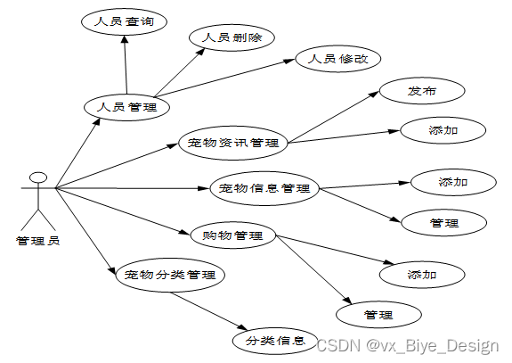 2.管理员主要负责人员管理、宠物信息管理、宠物资讯管理、购物管理,下图所示描述管理员的用例图。