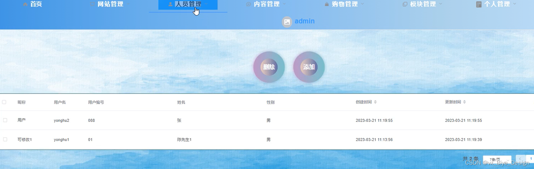 人员管理,管理员在此页面可以查看用户名、用户编号、姓名、性别等信息,并可根据需要进行删除、添加等操作