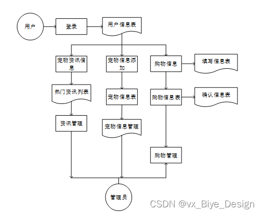 业务流程图(TFD)通过一些特定的符号描述业务的处理过程,它重点强调业务过程中每一项处理活动和具体业务部门的关系,选择部分模块进行具体描述。重点对本系统整体业务中最为主要的宠物信息查询及购物商城进行描述,用户进入宠物领养系统后进行各种模块信息的浏览,另外,管理人员进入后端管理,以执行宠物领养模块的相关管理方法,并在解决后向客户提供反馈机制。