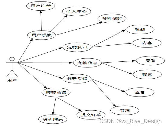 1.普通用户主要使用系统进行宠物查询、购物商城以及领养反馈,下图所示为普通用户的用例