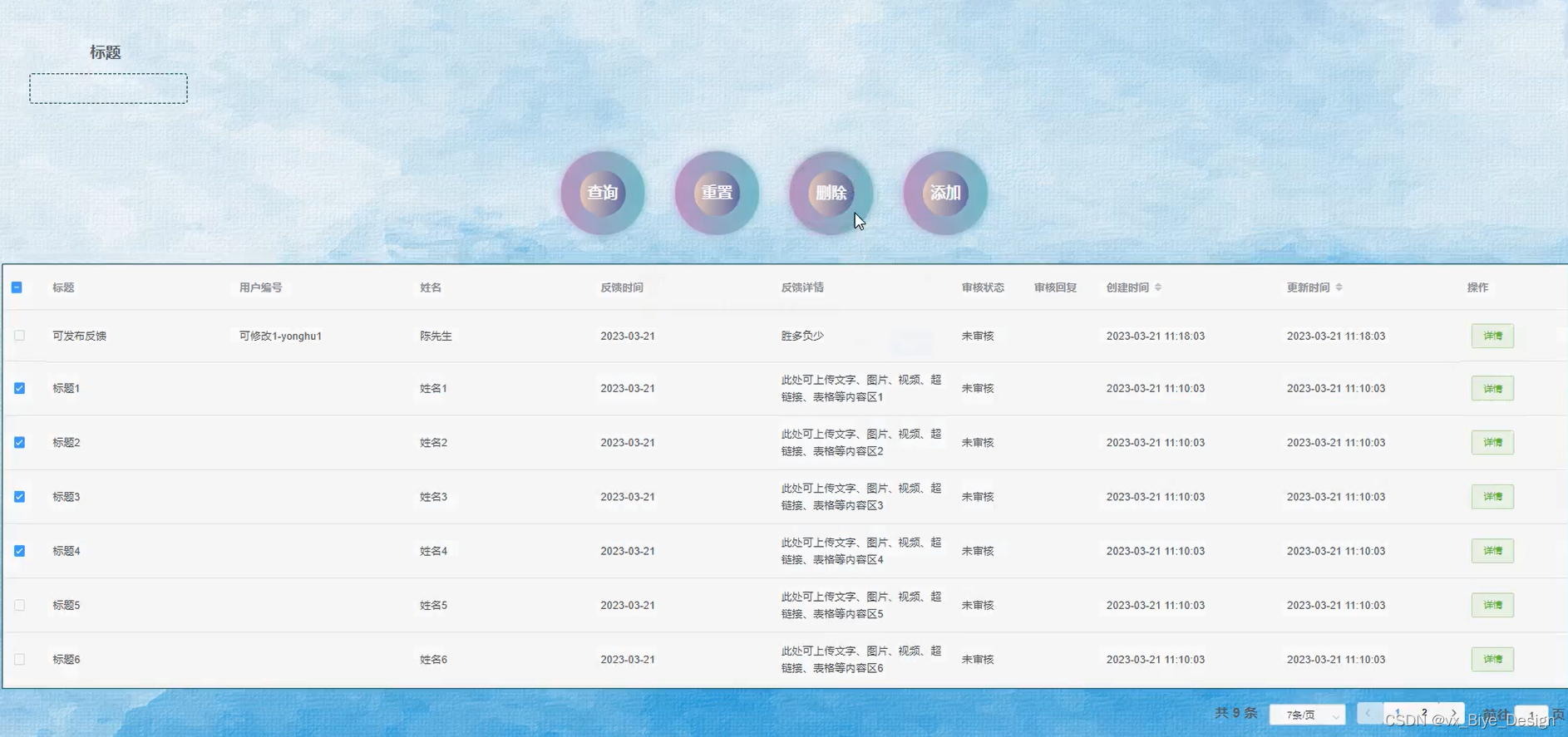 领养反馈,在此页面可以查看标题、用户编号、姓名、反馈时间、反馈详情等信息,进行查询、重置、删除、添加等操作。