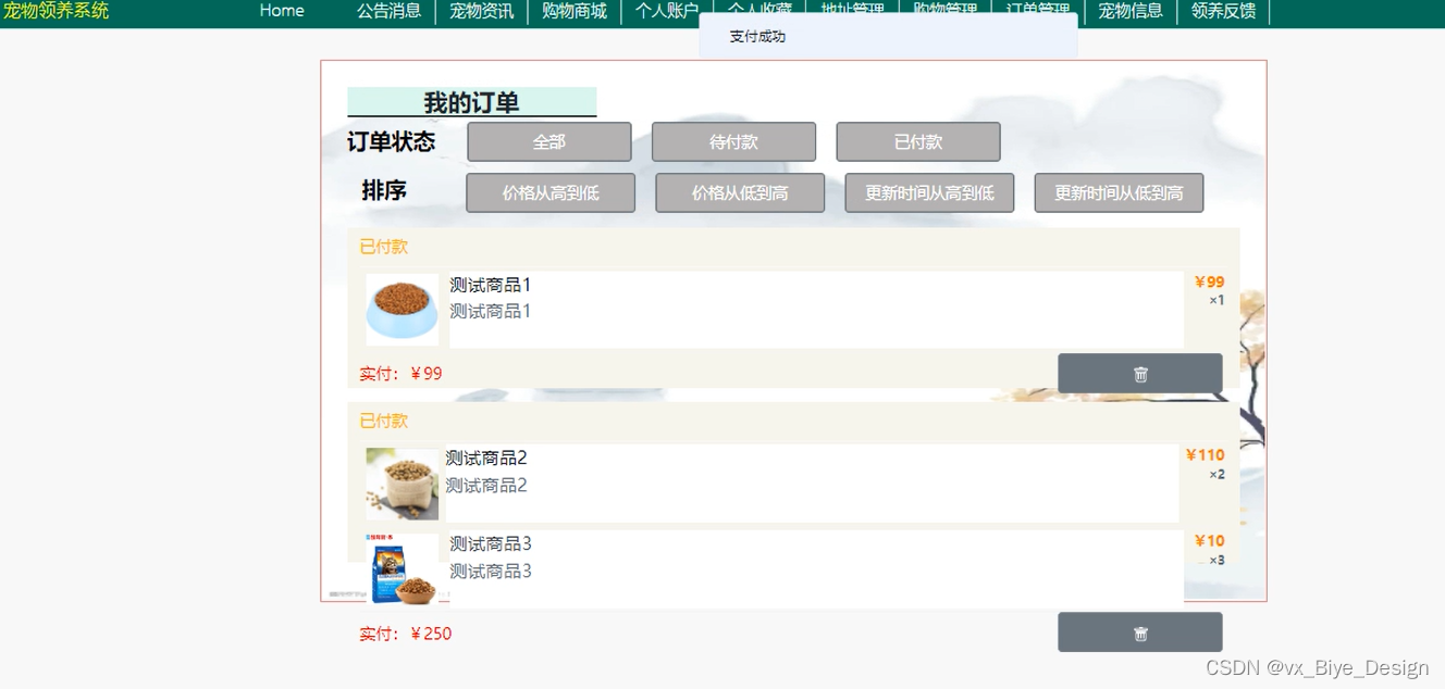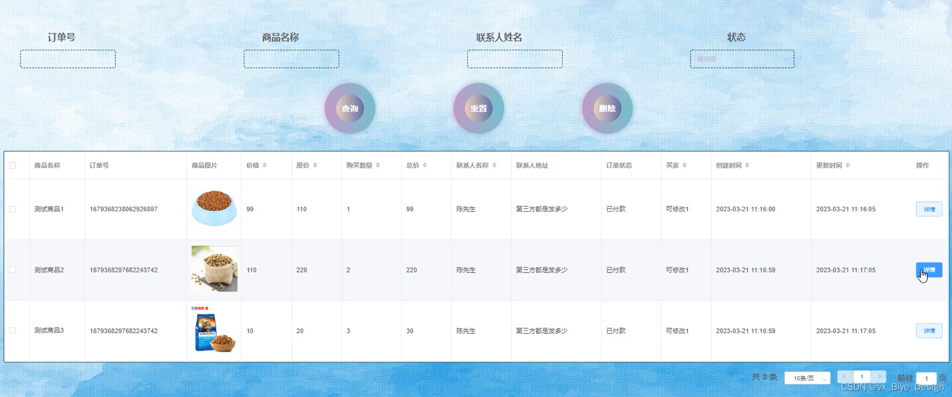 订单列表,在此页面可以查看商品名称、订单号、商品图片、价格、订单状态等信息,进行查询、重置、删除等操作。
