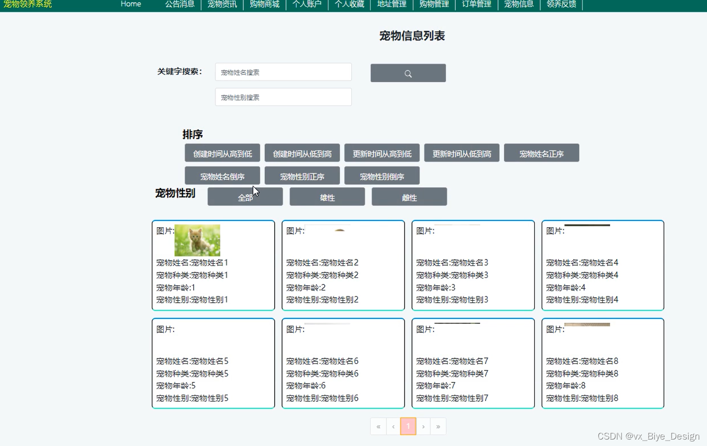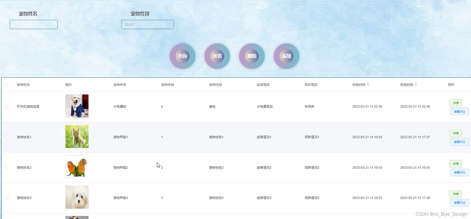 宠物信息,在此页面可以查看宠物姓名、图片、宠物种类、宠物年龄、领养情况等信息,进行查询、重置、删除、添加等操作。