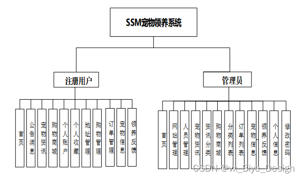 宠物领养系统主要是为了更加地完善宠物救助领养的服务情况,对用户的信息、宠物信息、宠物领养等提供了方便的机制。本系统有多类使用者,分别是管理员和注册用户。以下是从这两种用户的角度分别介绍本系统所要实现的功能。
