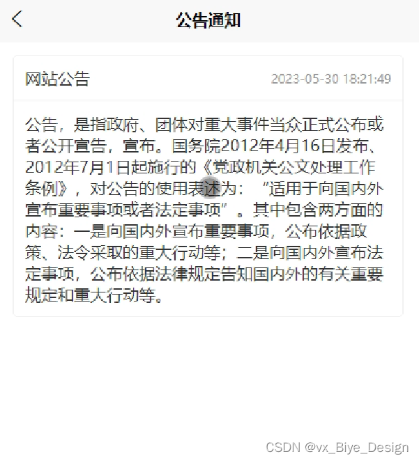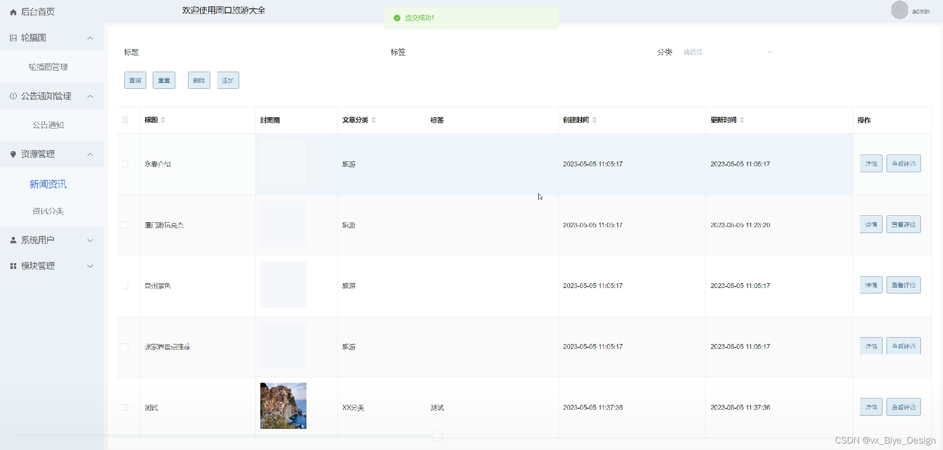 - 轮播图与通知公告管理:管理员可以对系统前台展示的轮播图以及公告进行增删改查,方便用户进行查看。