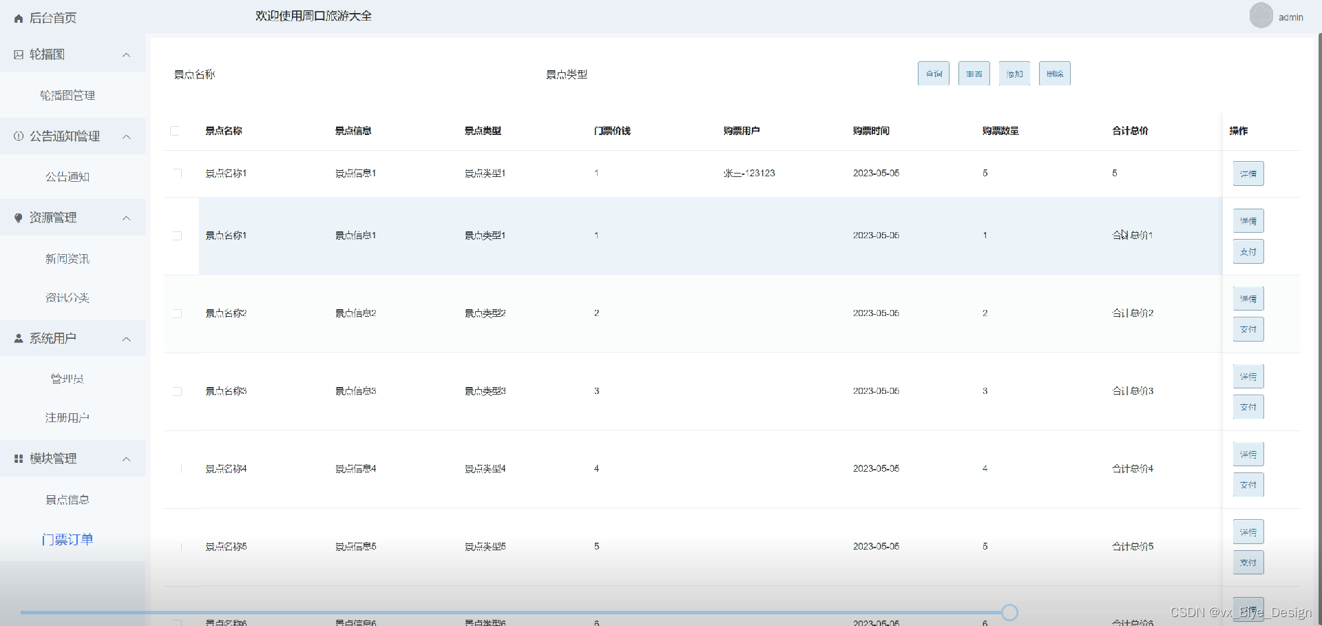(5)门票预订:用户可以在线进行景点门票的预订,还可以对订单进行查询、支付等操作。
