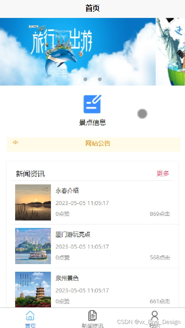 (2)查看周口旅游大全微信小程序的首页信息:周口旅游大全微信小程序的首页信息包含了首页、公告通知、新闻资讯、景点信息等。