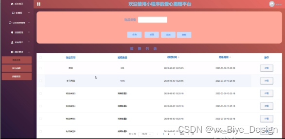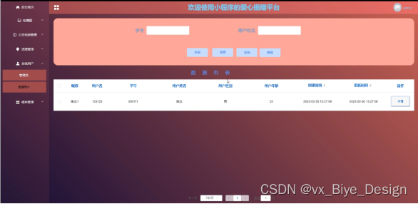 With the rapid development of our country's economy, people's demand for mobile phones is increasing, and various mobile software is also widely used. However, for data information management of mobile phones, various software for mobile phones are also highly favored by users. The love donation platform for mini programs is widely used by users, and users can easily manage the data information of the love donation platform for mini programs at any time, We have developed a love donation platform for the SSM mini program.
