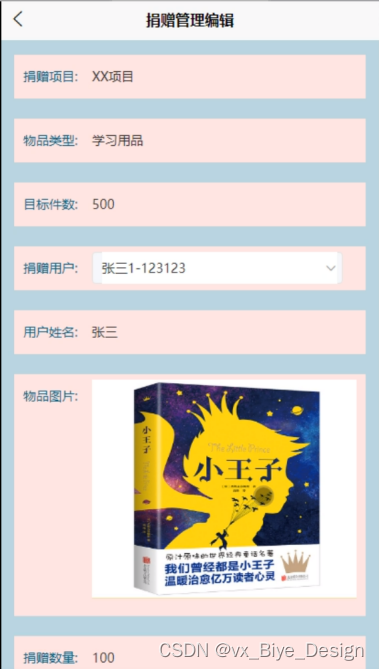 捐赠管理,在捐赠管理页面可以查看捐赠项目、物品类型、目标件数、捐赠用户、用户姓名、物品图片、捐赠数量等信息,如图5-7所示。