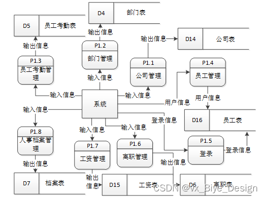 二层数据流程是对一层数据流层图中填写登录信息、用户功能的细化。即:填写登录信息细化为填制信息、后台审核,用户功能细化为首页、系统用户(管理员、普通用户)权限管理(权限列表)模块管理(公司信息、部门信息、部门名称、岗位名称、人事档案、调动记录、离职记录、考勤信息、薪资信息)等操作。