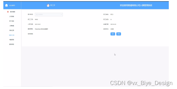 管理员点击离职管理菜单,点击离职添加子菜单,添加离职数据,填写离职信息成功后,离职数据页面刷新,新数据成功载入页面。