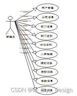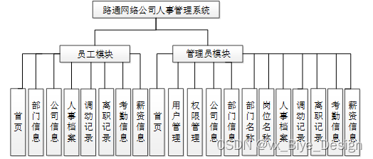 系统设计的目的是分析系统包括的所有功能结构,为开发人员设计开发和实现系统做好准备工作。经过前期的需求调查、分析和整理之后,确定的总体需求主要包括多个模块,分别是:首页、系统用户(管理员、普通用户)权限管理(权限列表)模块管理(公司信息、部门信息、部门名称、岗位名称、人事档案、调动记录、离职记录、考勤信息、薪资信息)。系统整体角色分为二个部分,一是员工、二是管理员。权限分布也是很明显,员工是在除去浏览信息之外还具有查询和管理自己账户信息、首页、公司信息、部门信息、人事档案、调动记录、离职记录、考勤信息、薪资信息等权限;管理员是最高权限拥有者。