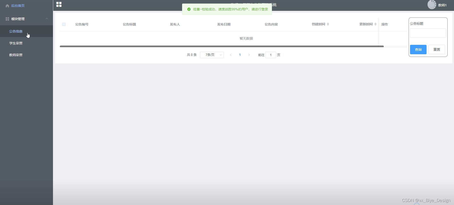 (2)公告管理:管理员可以发布公告表供教师/学生用户查看。