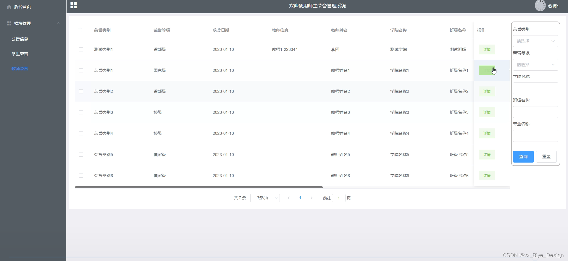 (3)教师荣誉:学生/教师点击“教师荣誉”这个菜单按钮,可以查看学校教师的各项荣誉信息然后进行搜索查询某个教师操作。