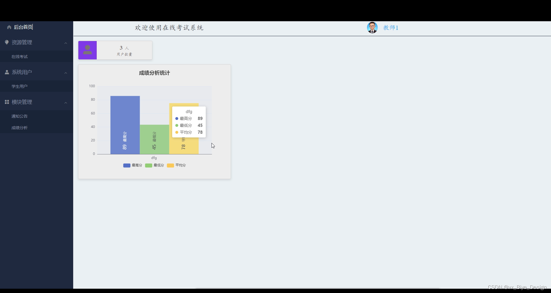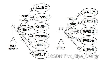 在线考试系统的主要使用者分为管理员,学生用户,教师用户,实现功能包括后台首页,资源管理(在线考试),系统用户(管理员,教师用户,学生用户),模块管理(通知公告,成绩分析)等功能。