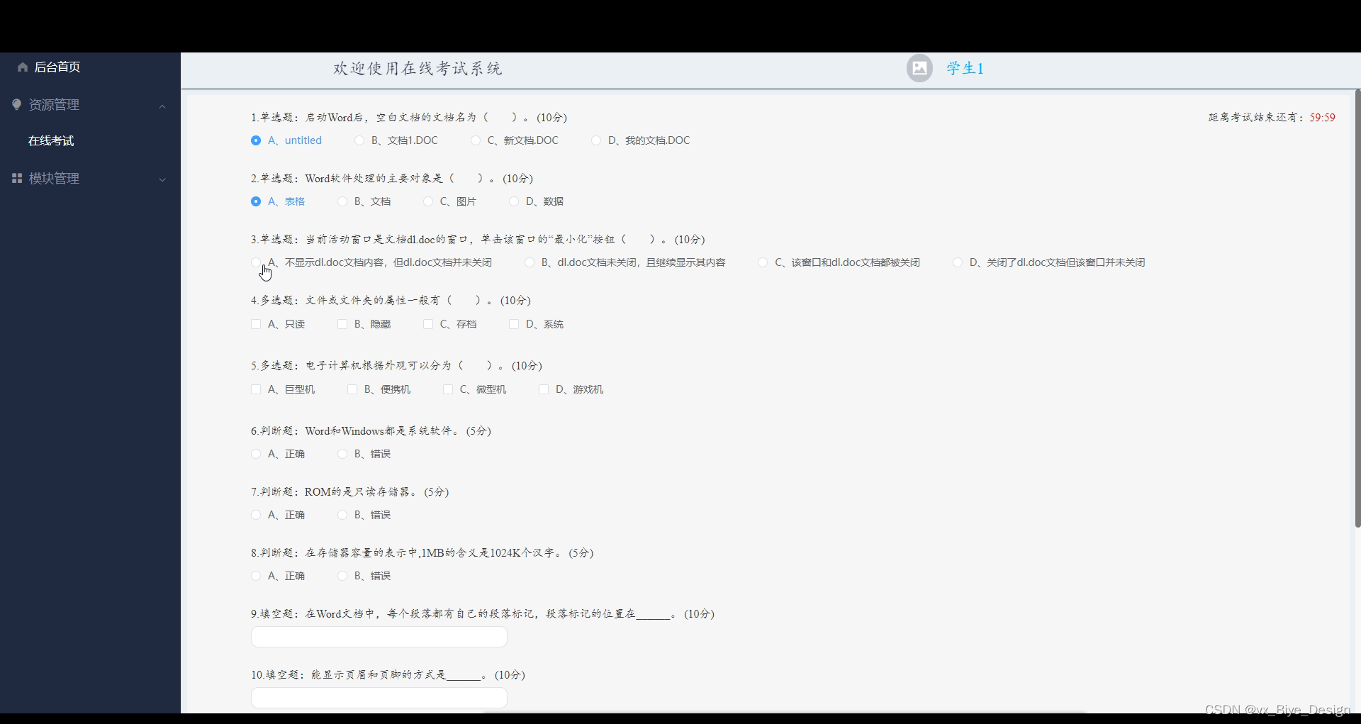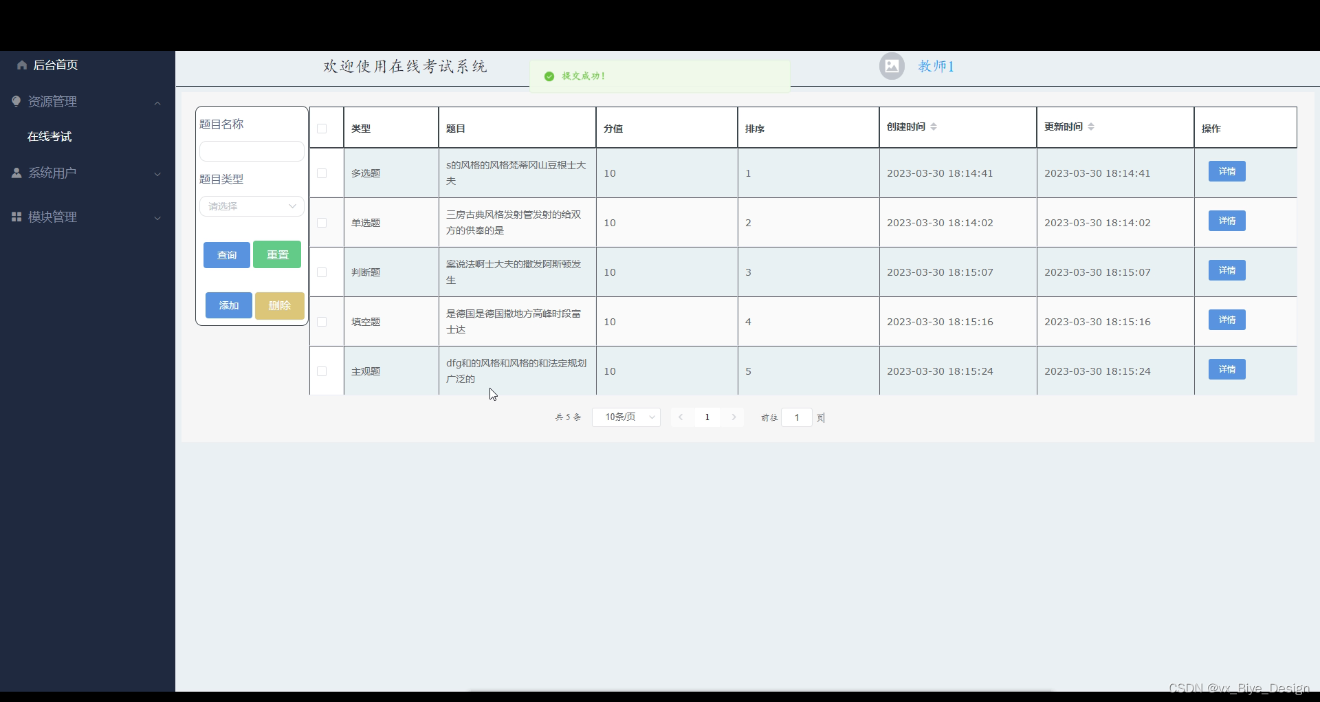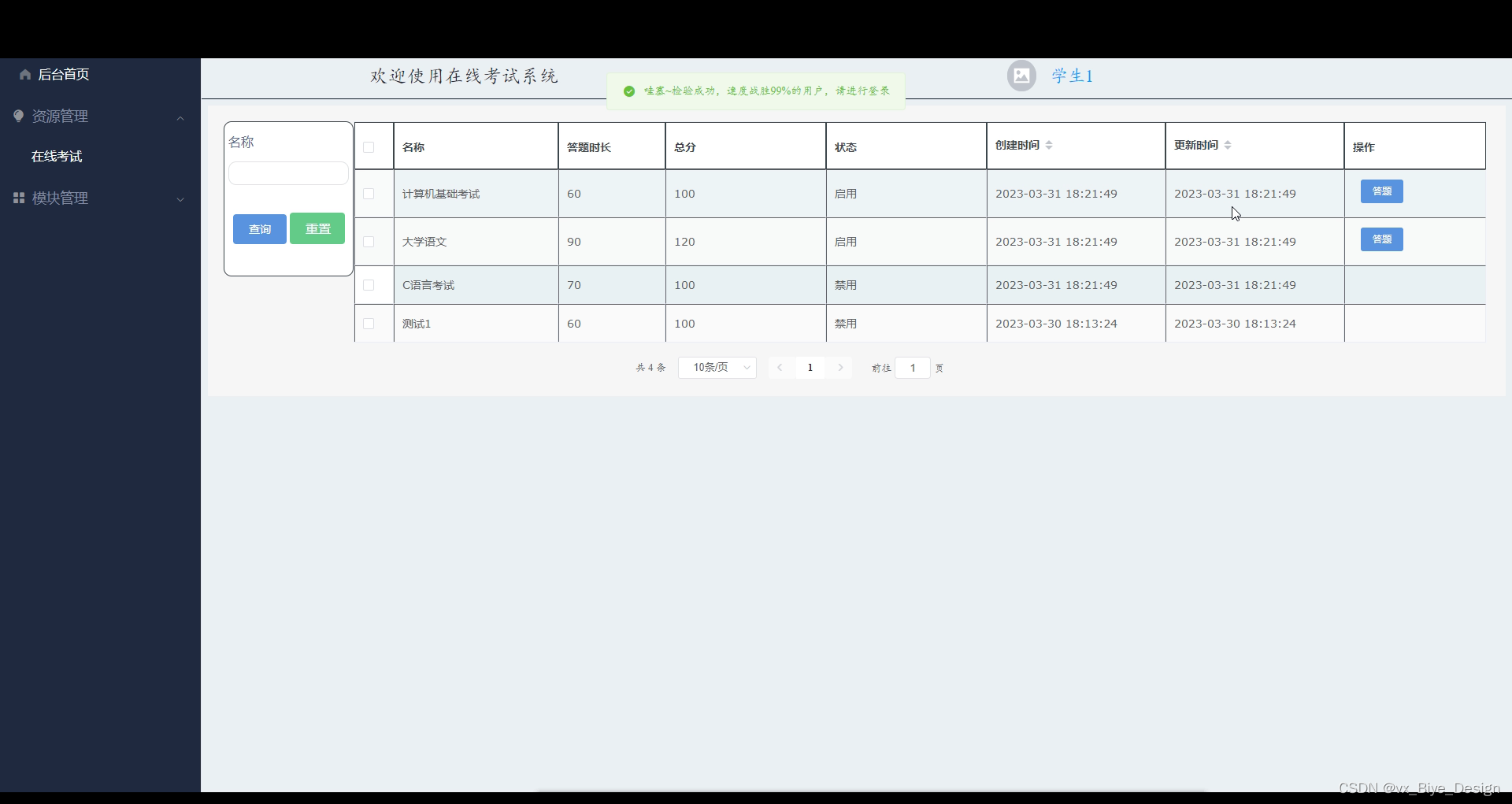 随着计算机互联网技术的迅猛发展,各行各业都已经实现采用计算机相关技术对日益放大的数据进行管理。该课题为设计一个在线考试系统,主要为了方便学生用户线上参加考试,查询成绩,查看考试通知,也方便教师在线设计题库,阅卷改卷,维护成绩,方便管理员对人员进行更加方便快捷的管理,大幅提高考试、阅卷的效率。