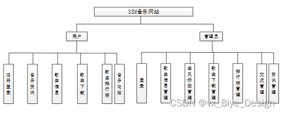 音乐网站的功能主要分为前台用户根据自己的需求进行注册登录,对音乐资讯进行浏览,歌曲搜索。后台系统管理员主要对注册用户,资讯数据,歌曲信息等进行管理。