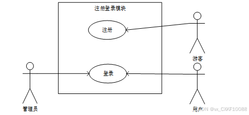 (1)注册登录模块:注册是游客独有的功能,注册后就成了系统的正式用户了,然后游客通过前台登录,管理员和卖家用户通过后台登录。注册登录模块用例如下图2-1所示。