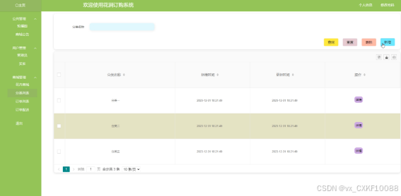 管理员拥有对花卉商品的分类增删改查的功能,分类列表界面如下图4-16所示。