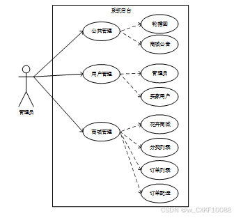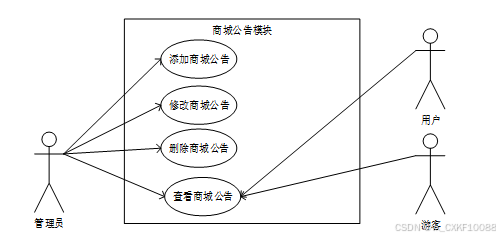 (2)商城公告模块:用户可以查看商城公告,管理员可以添加、修改、删除商城公告。商城公告模块用例如下图2-2所示。