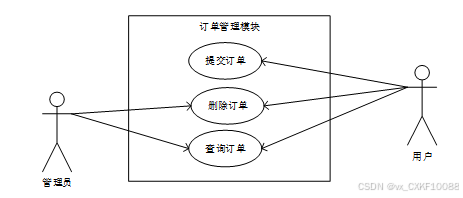 (6)订单管理模块:订单管理模块是前台用户和后台管理员都有的功能,前台用户可以提交订单,管理订单,管理员能够对用户订单进行管控。订单管理模块用例如下图2-6所示。