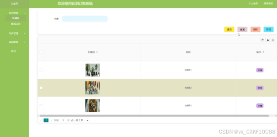 管理员在后台公共管理界面可以对系统的轮播图和商城公告进行增删改查。轮播图管理界面如下图4-13所示。