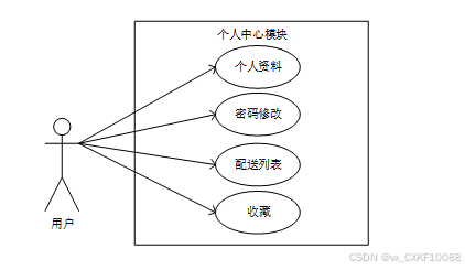 (7)个人中心模块:个人中心模块是用户独有的功能,可以在“我的账户”管理个人资料,密码修改,也可以在“个人中心”对配送列表和自己收藏的信息进行管理,个人中心用例如下图2-7所示。