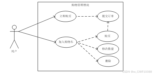 (5)购物管理模块:购物管理是前台用户独有功能,用户可以选择两种购买方式,一种是把花卉商品加入到购物车,另一种是直接购买,最终实现购物功能,购物管理模块用例如下图2-5所示。