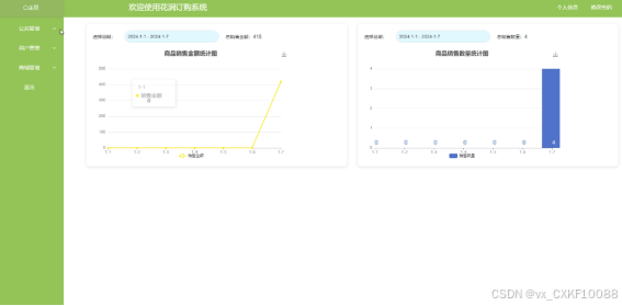 管理员登录后台首页,可以查看到每日花卉商品销售数量和销售金额的统计图分析。后台首页界面如下图4-12所示。