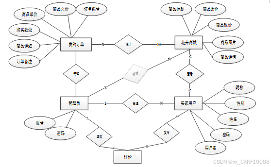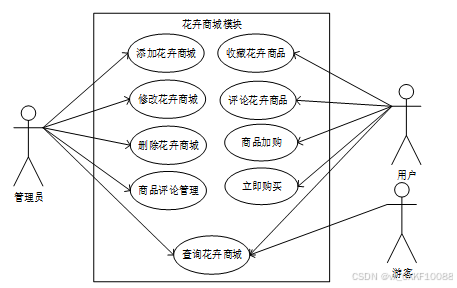 (3)花卉商城模块:游客可以查看花卉商城,用户可以对商城中的花卉商品收藏、评论、加购、立即购买,管理员可以添加、修改、删除花卉商品,管理花卉商品评论。花卉商城模块如下图2-3所示。