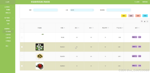 管理员拥有对花卉商城中的花卉商品进行添加、修改、删除、管理评论的功能,花卉商城管理界面如下图4-15所示。