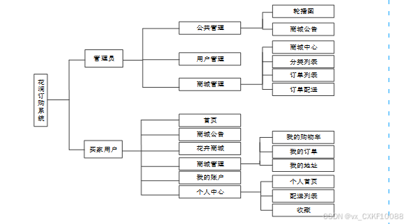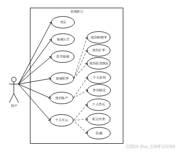 本花涧订购系统的设计主要是针对三种用户进行使用,第一种是以游客身份使用,游客在进入系统后可以查看到系统中的所有内容,包括首页、商城公告、花卉商城、商城管理,如果想要购买下单,可以注册登录;第二种是注册之后有账号的用户,登录以后可以收藏、评论、购买、管理收货地址、订单、个人资料等;第三种则是管理员,是系统的管理者,管理员对系统中的商城公告、花卉商品/花卉分类、用户提交的订单进行整体把控。