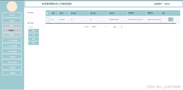 基于web的高校无人车配送系统中的管理人员是可以对注册的普通用户、发布用户进行管理的,也可以对管理员进行管控。界面如下图4-8所示。