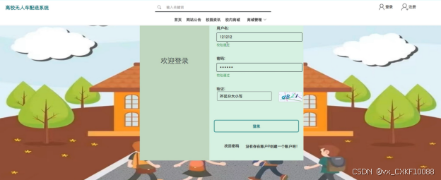 基于web的高校无人车配送系统中的注册后的用户是可以通过自己的账户名和密码进行登录的,当用户输入完整的自己的账户名和密码信息并点击“登录”按钮后,将会首先验证输入的有没有空数据,再次验证输入的账户名+密码和数据库中当前保存的用户信息是否一致,只有在一致后将会登录成功并自动跳转到基于web的高校无人车配送系统的首页中;否则将会提示相应错误信息,用户登录界面如下图4-2所示。