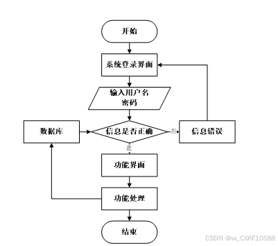用户打开并进入系统后,会显示登录界面,输入正确的用户名和密码,系统自动检测信息,若信息无误,则用户会进入系统功能界面,进行操作,否则会提示错误无法登录,操作流程如图2-3所示。