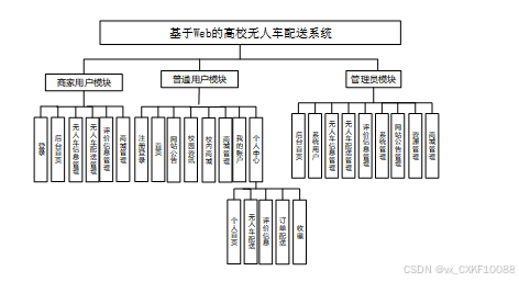 按照基于web的高校无人车配送系统的角色,系统划分为了普通用户模块、商家用户模块和管理员模块这三大部分。
