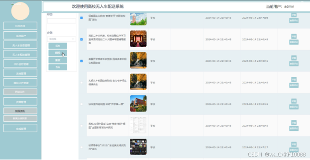 商城管理(校内商城、分类列表、订单列表、订单配送):管理员可以对系统中的校内商城、分类列表、订单列表、订单配送进行管理,包括对其信息的添加、删除等操作。通知公告管理界面如下图所示。