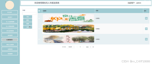 (6)系统管理(轮播图管理):管理员可以对系统中的轮播图进行管理,包括轮播图的查询、添加、修改和删除等操作。