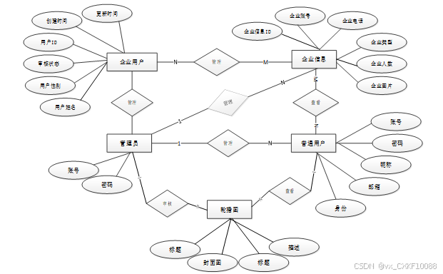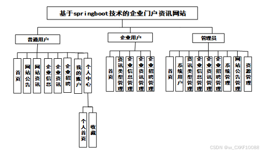 企业门户资讯网站的设计与实现分为三大部分:管理员模块、普通用户模块和企业用户。