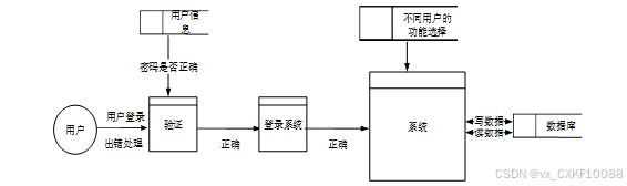 系统顶层数据流:外部实体为用户,第一个流程为登录验证,用户信息表返回密码验证,是否正确,正确则登录系统,错误咨询信息,登录系统后,根据不同用户的功能选择,来读写数据库。