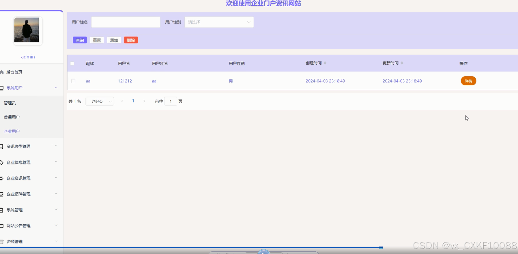 管理员可以对系统中所有的用户角色进行管控,包含了管理员、普通用户、企业用户这三种角色,如果需要添加新的用户,点击页面中的“添加”按钮根据提示输入上用户信息,点击“提交”以后在对应的用户界面就可以查看到了,可以点击用户后面的“删除”按钮直接删除某一用户。系统用户管理界面如下图所示。