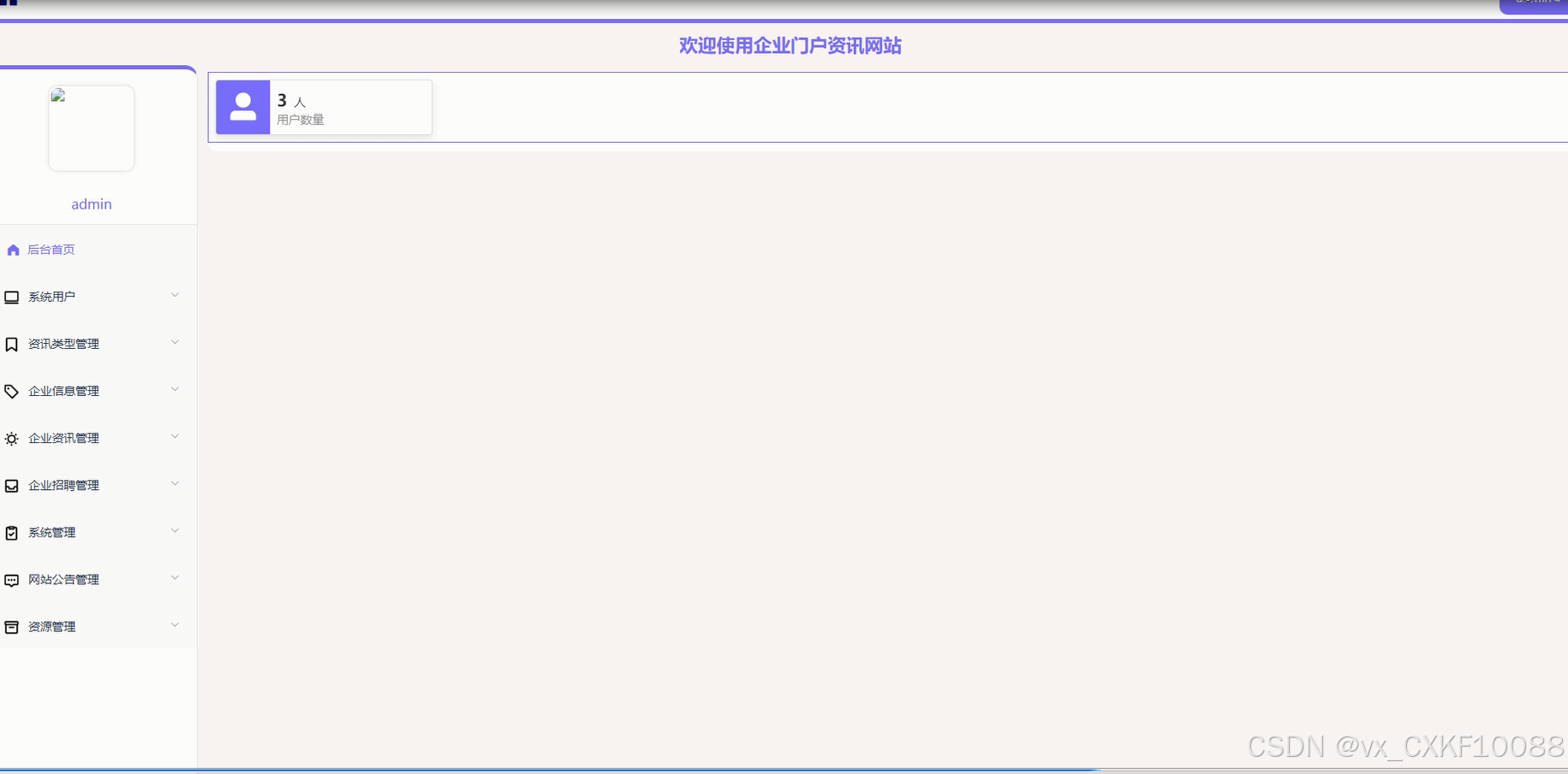 管理员可以查看后台首页、系统用户、资讯类型管理、企业信息管理、企业资讯管理、企业招聘管理、系统管理、网站公告管理、资源管理等,并且可以根据需要进行相应的操作,管理员功能界面如下图所示。